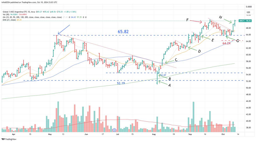 Prior posts on the 1/10 and 17/9 covered several long entries (A, B, C, D, E and G) over the last few months for ARGT, the US-listed, Argentine ETF.