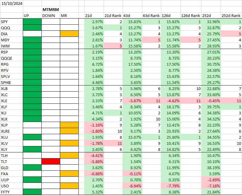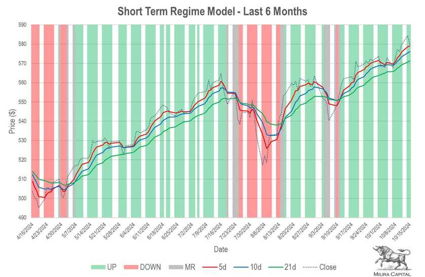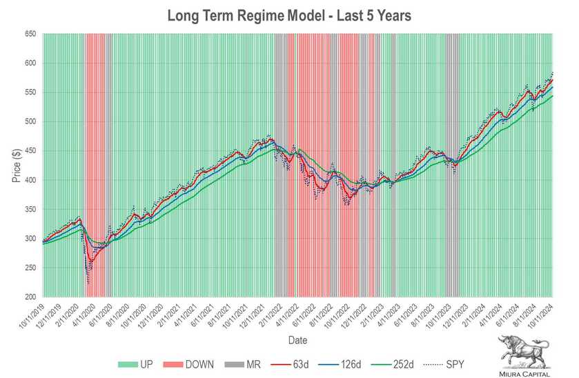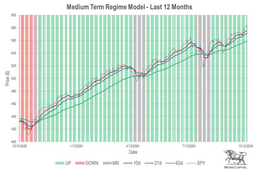 Short, medium and long-term regime models are all aligned in UP regimes. This is one of the strongest regime combinations (4/15) since 1950. It is also the most common. The three combinations that perform better are: