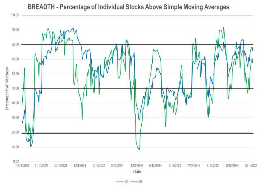 Breadth, as measured by the percentage of S&P 500 stocks above their individual moving averages, remains strong across all time horizons.