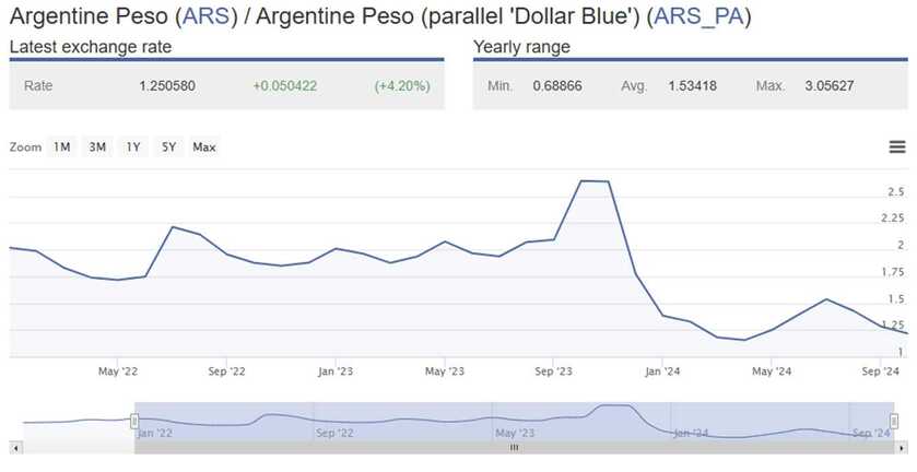 The spread between the black market exchange rate (the so-called "Blue Dollar") and the official exchange rate continues to narrow. Down from 2.6x when Milei got elected in October 2023  to 1.2x now.  I consider this spread to be a real-world, market-based measure of inflation expectations.