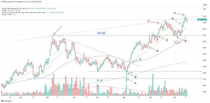 The Argentine market looks set for a possible pullback or consolidation here (point I). If I had to guess, I'd say that it would drift down to meet the rising 10d and 21d moving averages somewhere between $68 and $70. This would be normal and such a pullback/consolidation may present follow on buy setups.