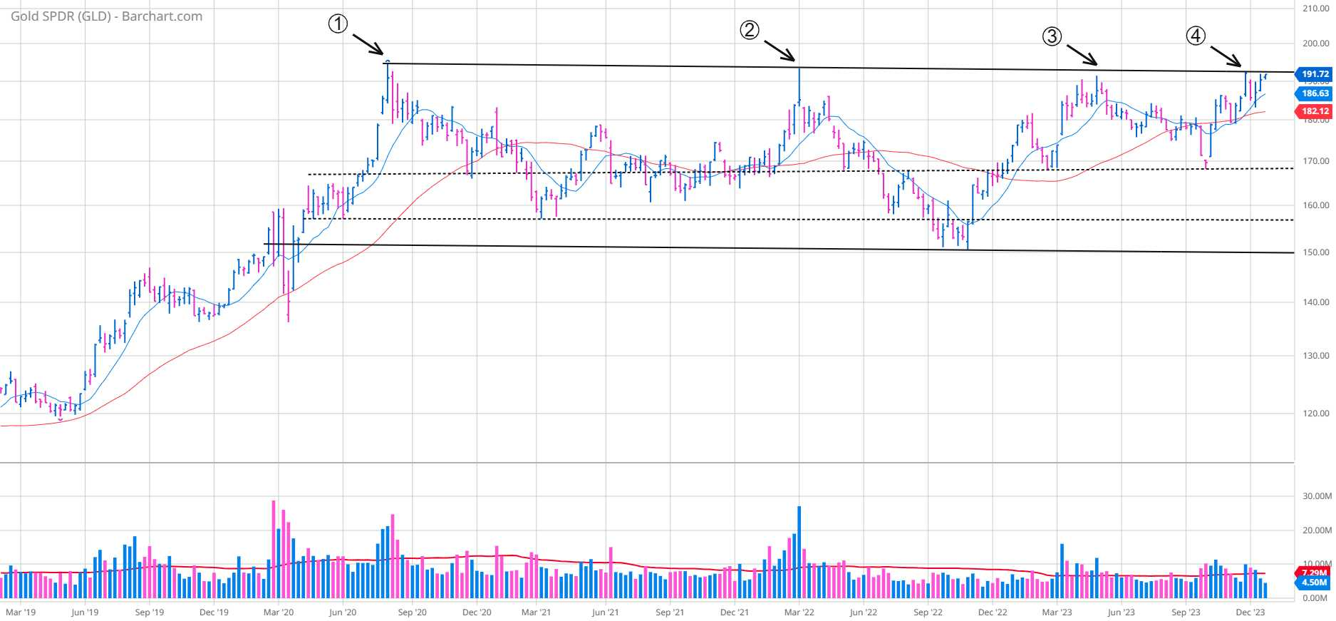 GLD is tightening up and becoming less volatile. This suggests that demand is strong.