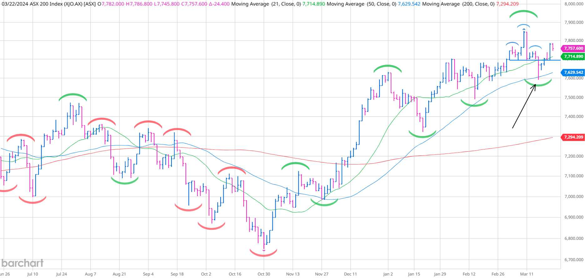 Longer term uptrend remains intact until the ASX 200 makes a lower low, breaking down below the 50d MA and 7,600 (shown with an arrow).