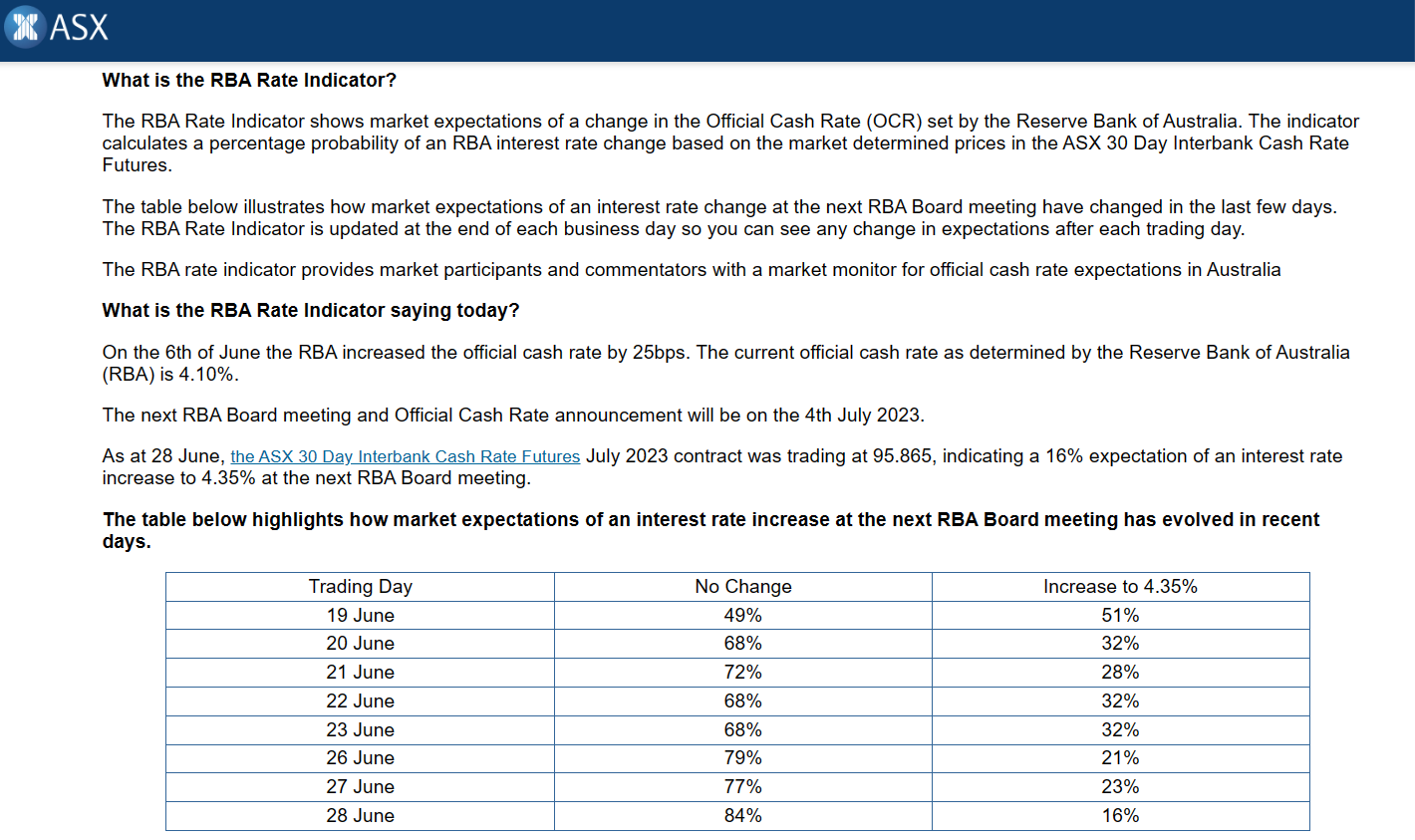 Interesting to note the correlation between the weakness in the AUD over the last 10 days and the market implied probability of an RBA rate hike in July. Back on the 19/6, the market thought there was a 51% chance of a rate hike. That has now fallen to 16% on 28/6. I see this pattern of the volume and price action leading the news (and not the other way around) all the time.