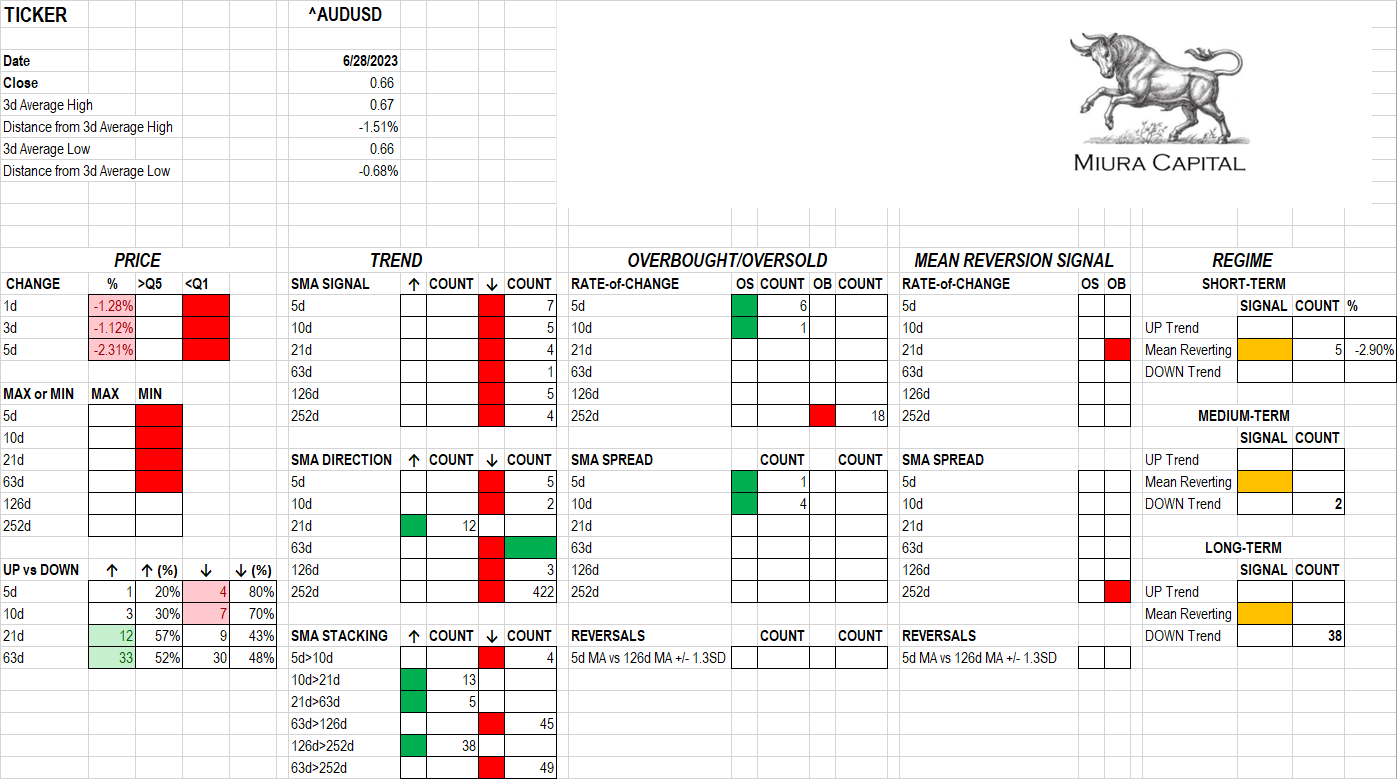 It's hard to have a lot of conviction about anything the AUD might do next at the moment. Take a look at the Trend V.s Mean Reversion Dashboard. It's a dog's breakfast. Hard to discern a pattern which is actually the point as it confirms that the AUD is still stuck chopping in a range.